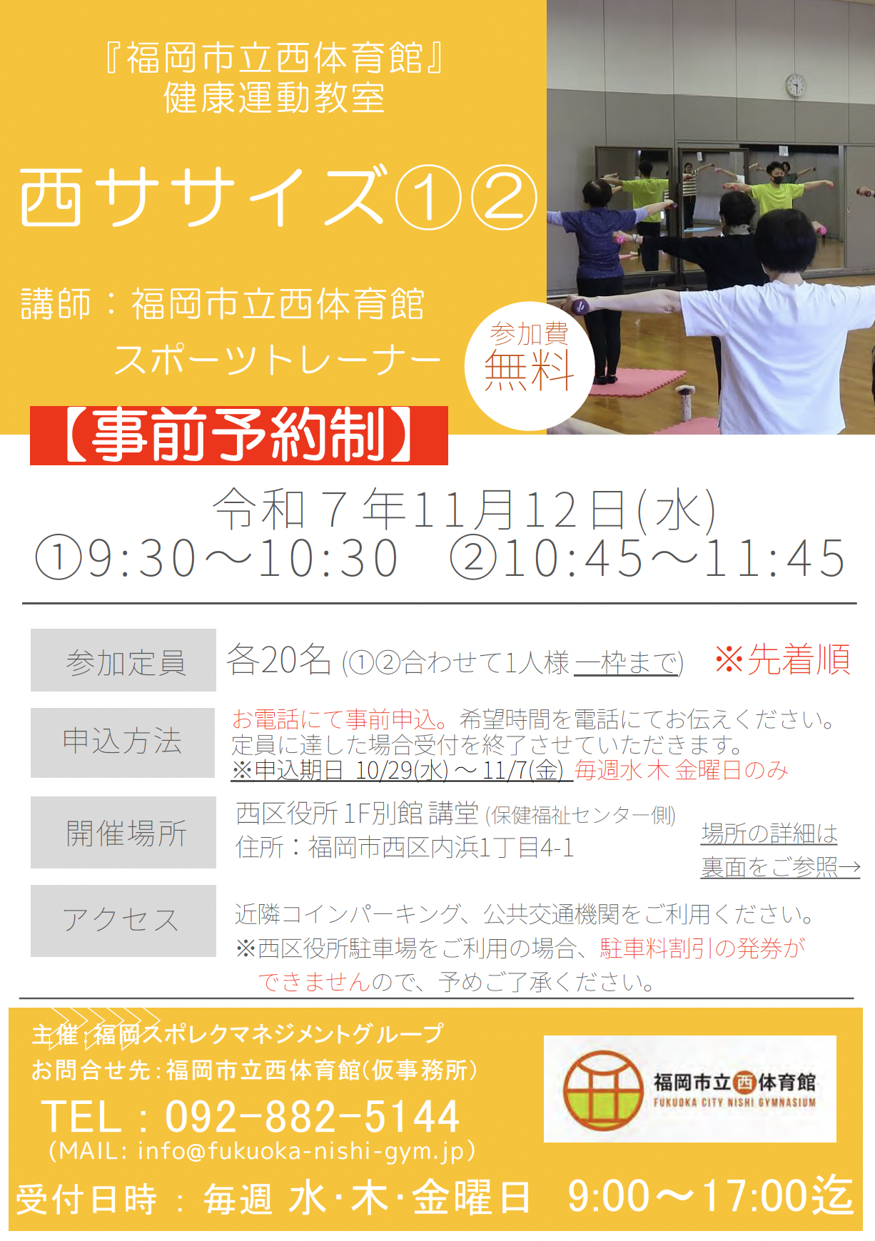 【参加方法】開始15分前~ロビーにて受付開始。①名簿に氏名を記入 ②トレーニング室の利用券を受付で購入 ③トレーニング室のストレッチマットに集合